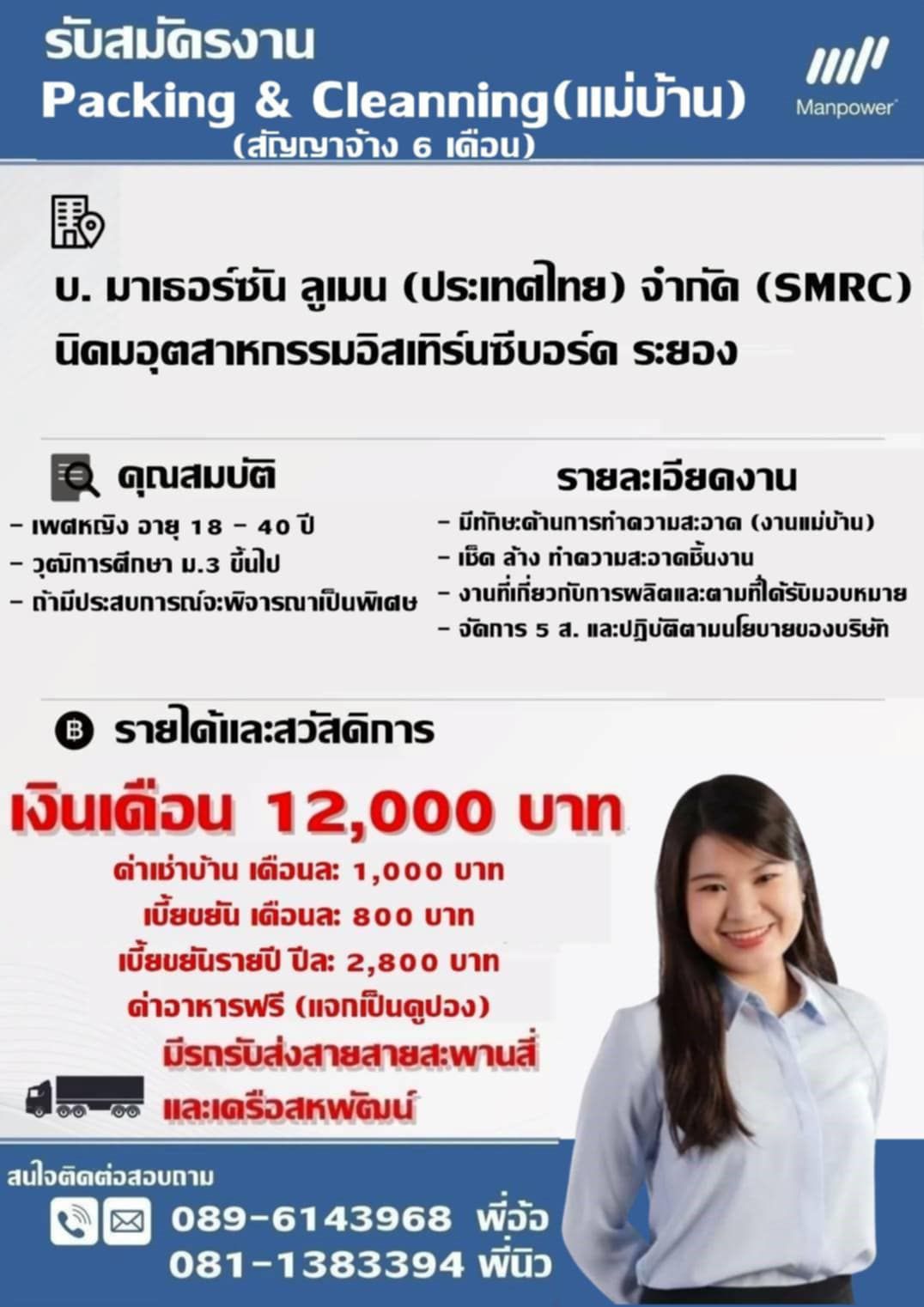 #ข่าวสมัครงาน รับสมัครพนักงาน บริษัท มาเธอร์ซัน ลูเมน (ประเทศไทย) จำกัด รับสมัครพนักงานหลายตำแหน่ง ค่าแรง 12,000 บาท มีเบี้ยขยันให้ ปลวกแดง, ระยอง