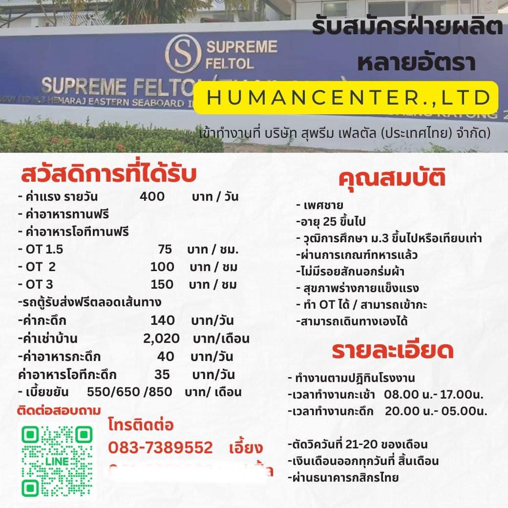 รับพนักงานเข้าประจำบ.สุพรีม เฟลตัล (นิคมเหมราชใหม่)