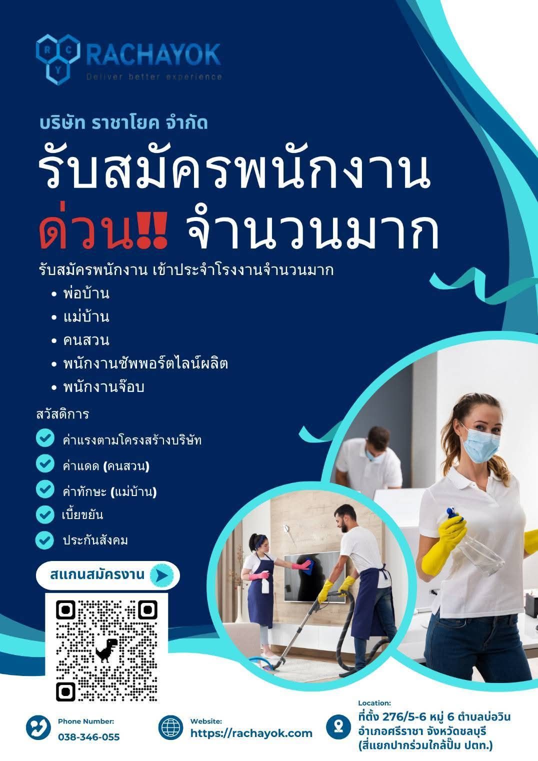 : สนใจสมัครได้ที่ บริษัทราชาโยค จำกัด ตั้งอยู่สี่แยกปากร่วมฝั่งเดียวกับปั้มปตท เลยปั้มมาประมาณ300เมตร